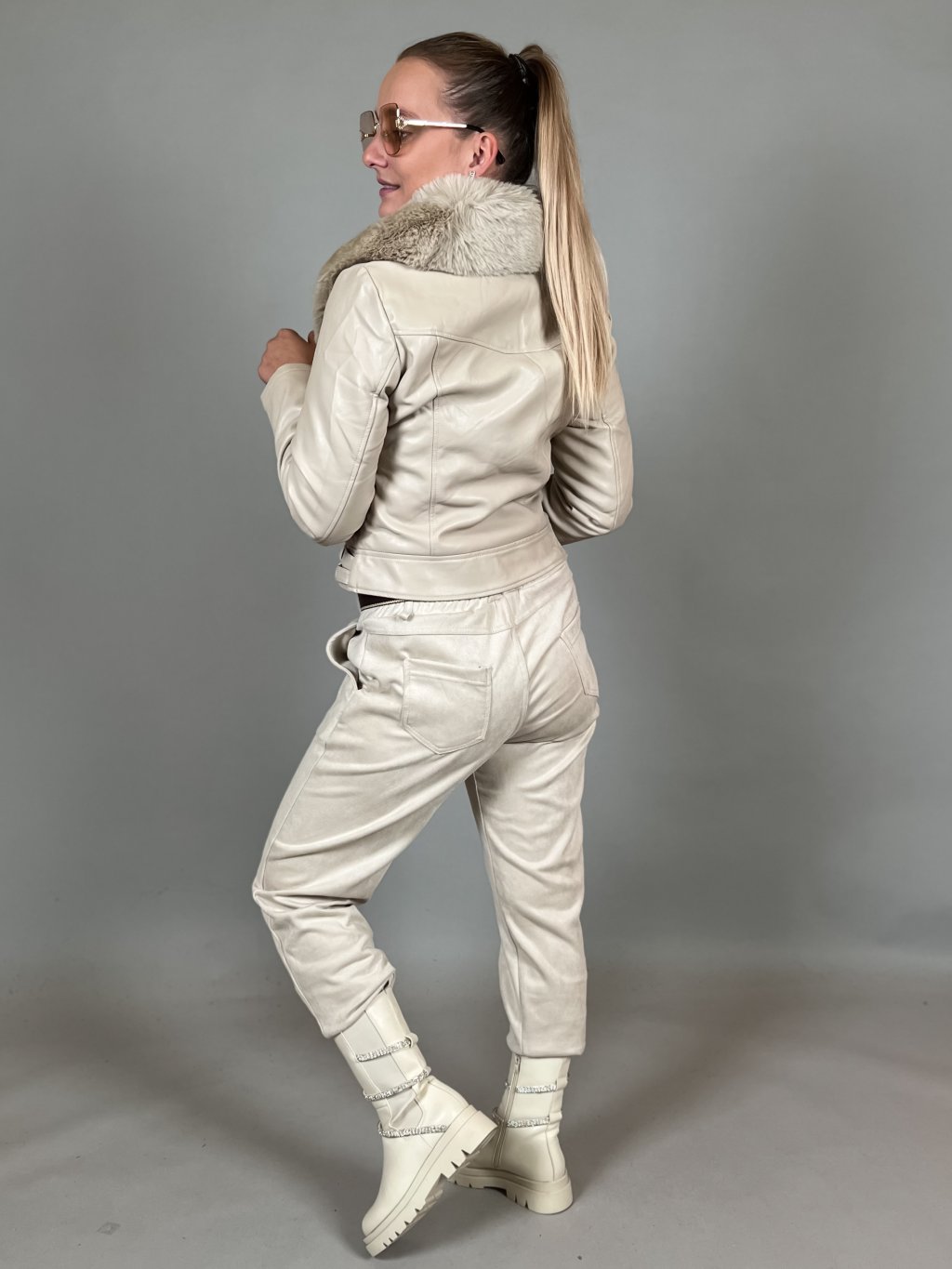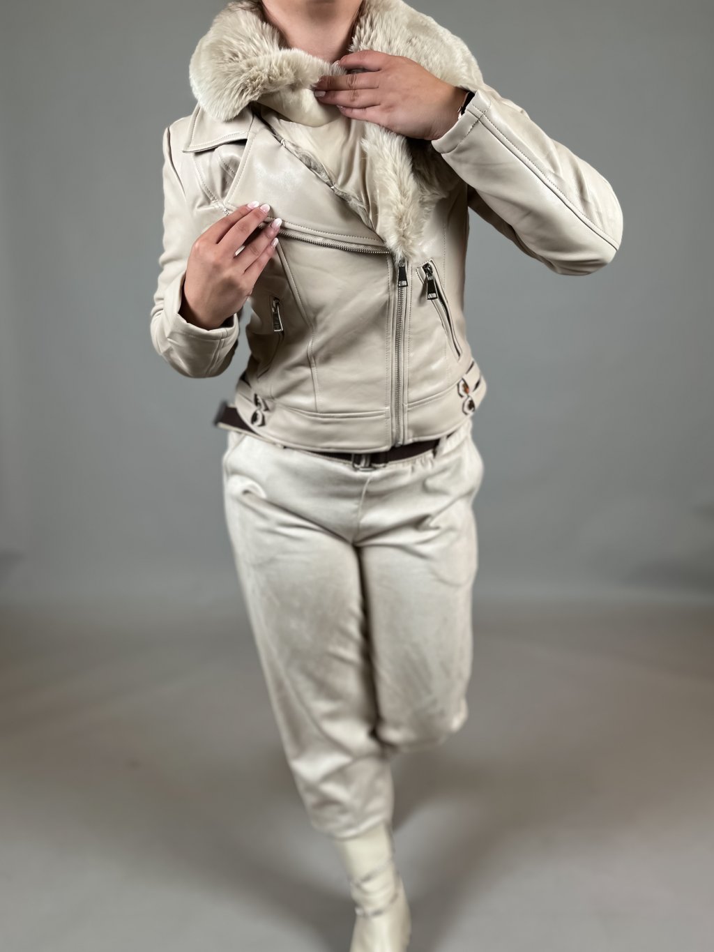 zateplený křivák s kožíškem odepínací kožešinový límec modelka fotí velikost: Míša S měkká koženková bunda Míry modelek jsou k dispozici zde: Míry...