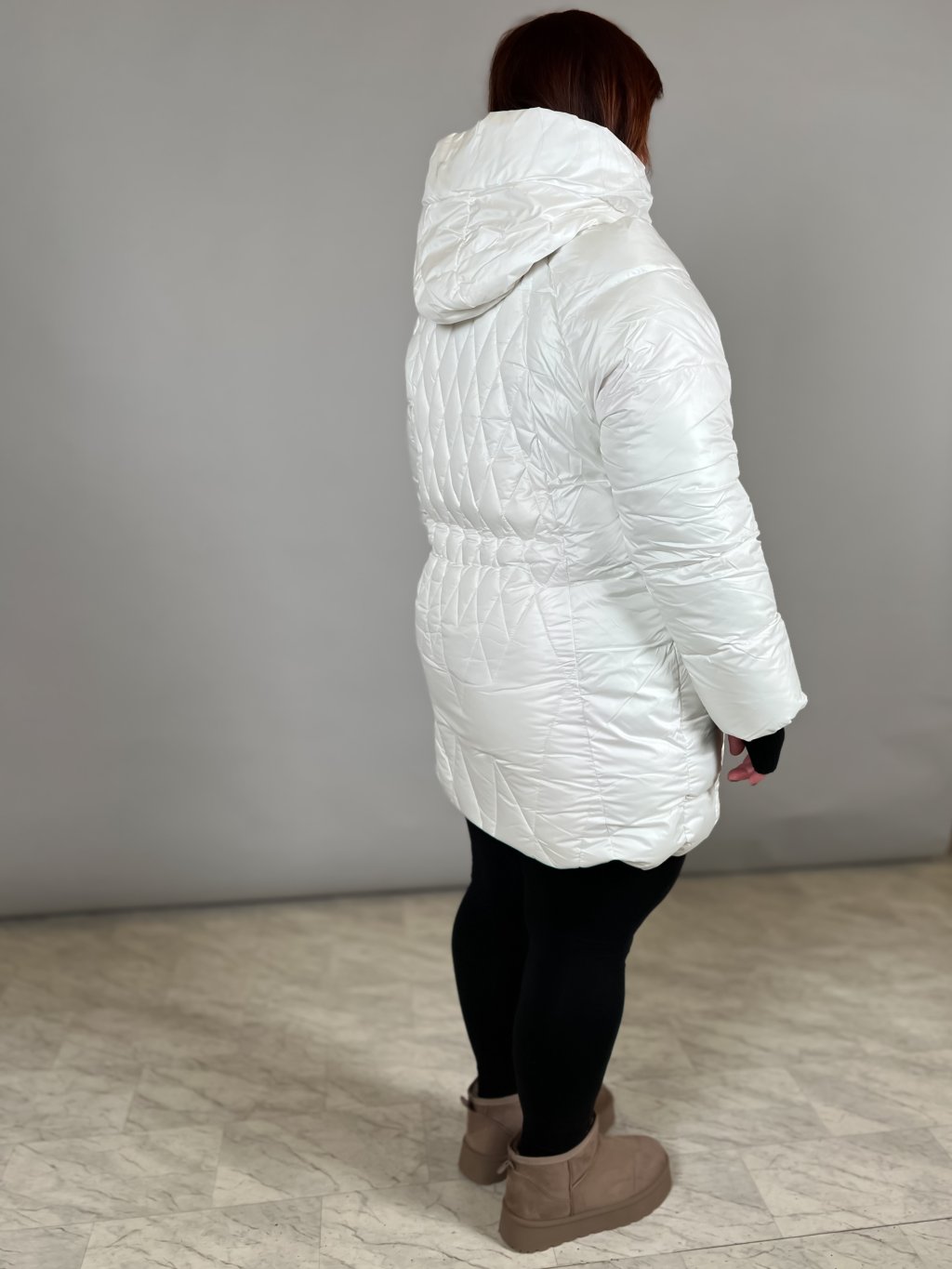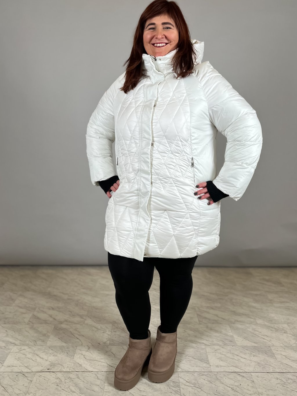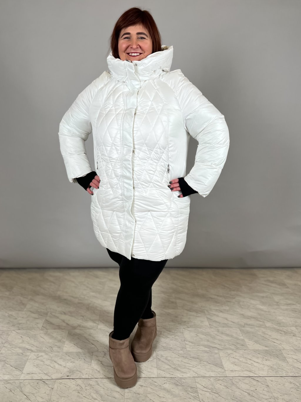 přechodová bunda s kapucí modelka fotí velikost: Andrejka 6XL delší bunda se stojáčkem a kapsami ozdobné patky zipy ze stran ozdobný štítek na levém...