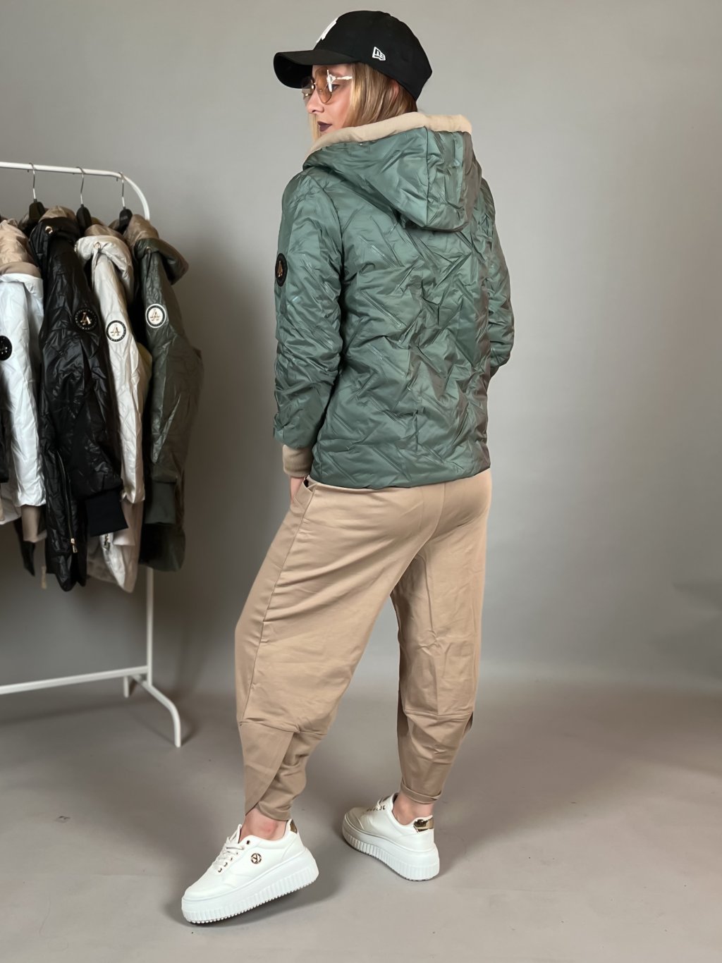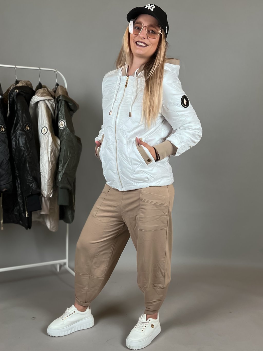 přechodová bunda s kapucí modelka fotí velikost: Andrejka 6XL delší bunda se stojáčkem a kapsami ozdobné patky zipy ze stran ozdobný štítek na levém...