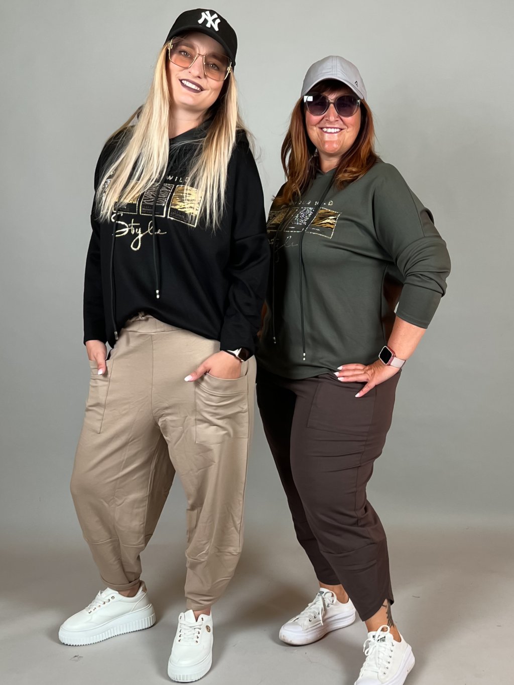 strečové kalhoty v pase na gumu modelky fotí vel. 1 a 3 kapsy široké nohavice Rozměry: Velikost 1-pas 68-80 boky 102 délka 103 Velikost 2-pas...