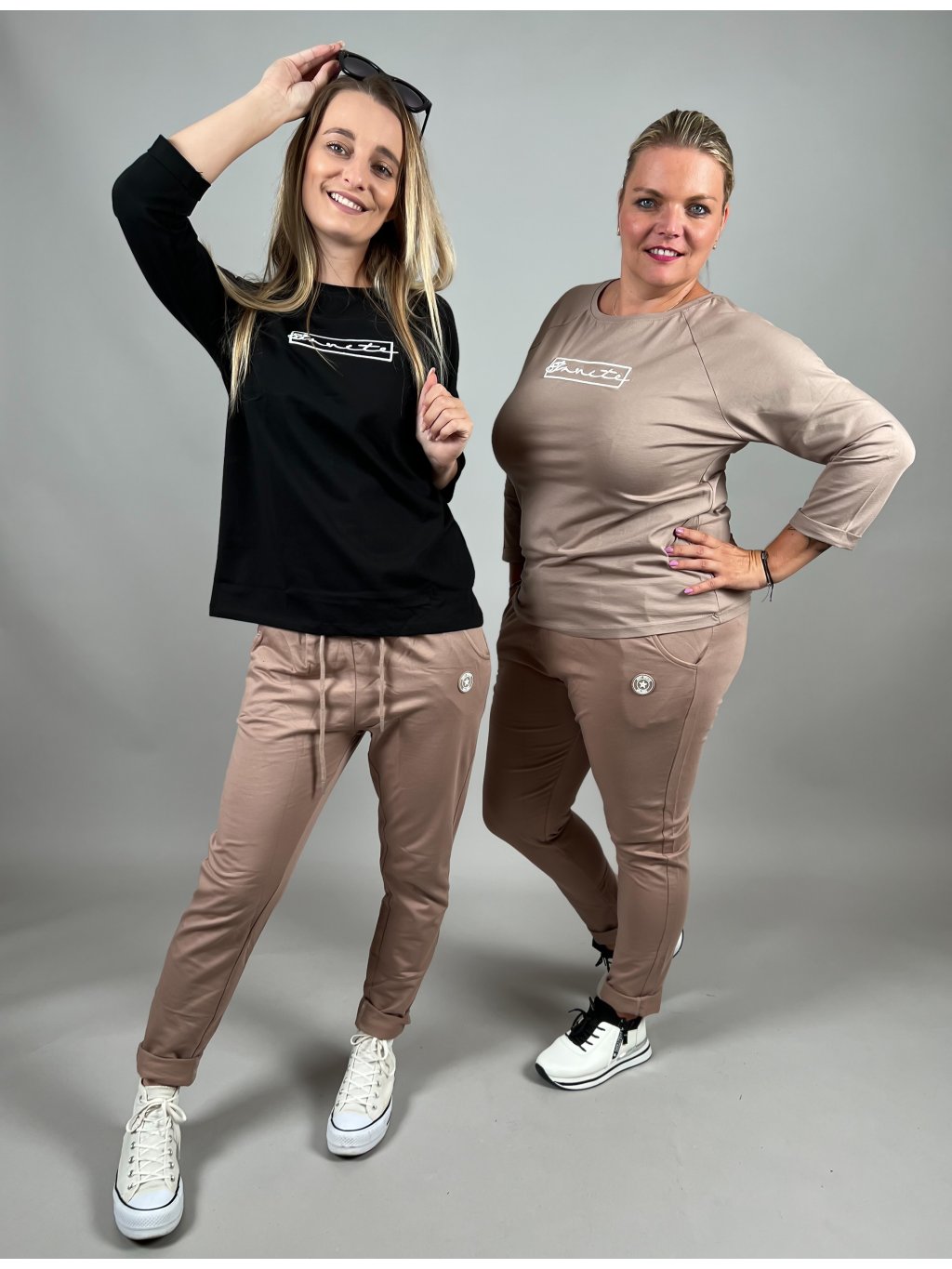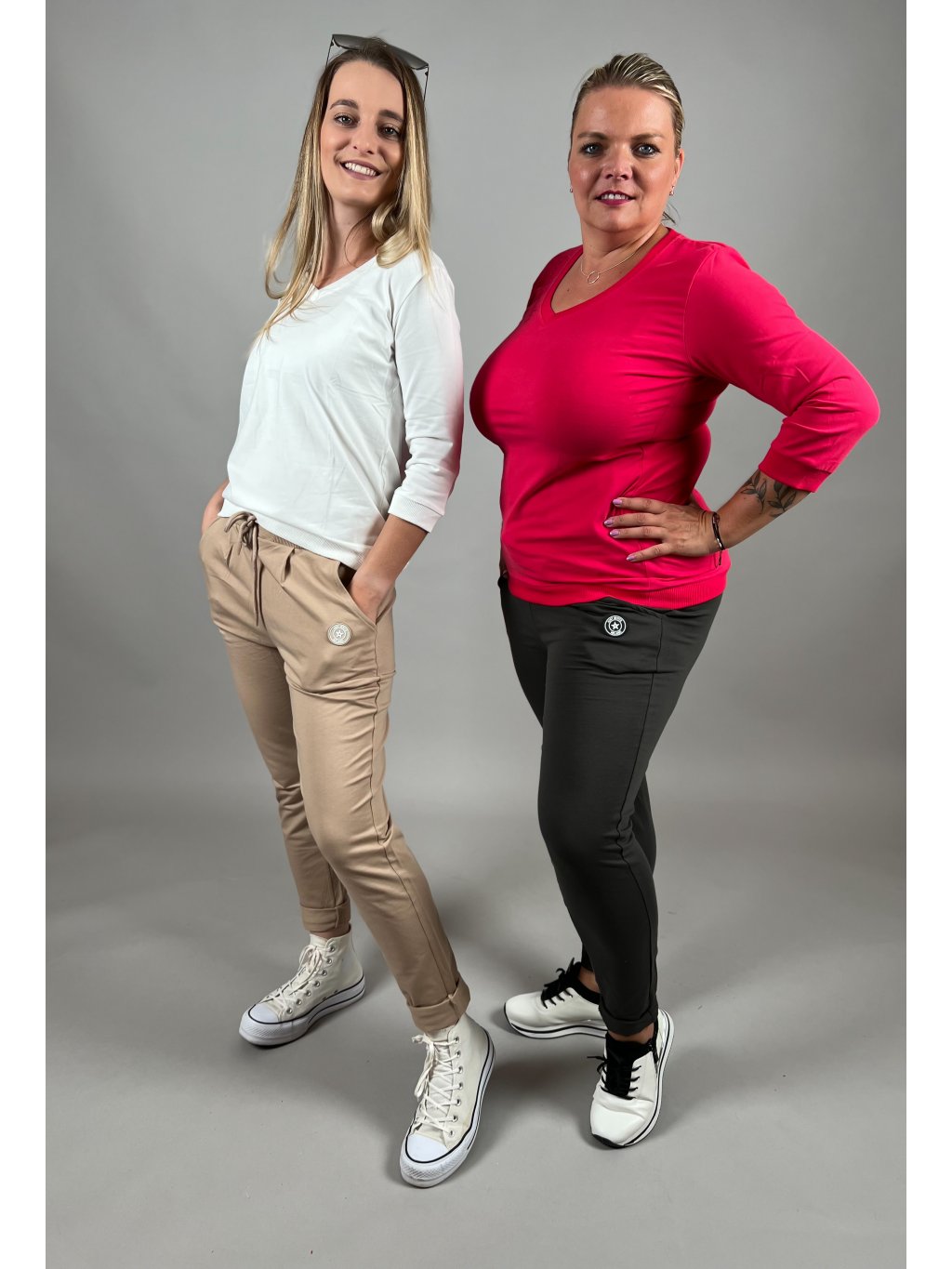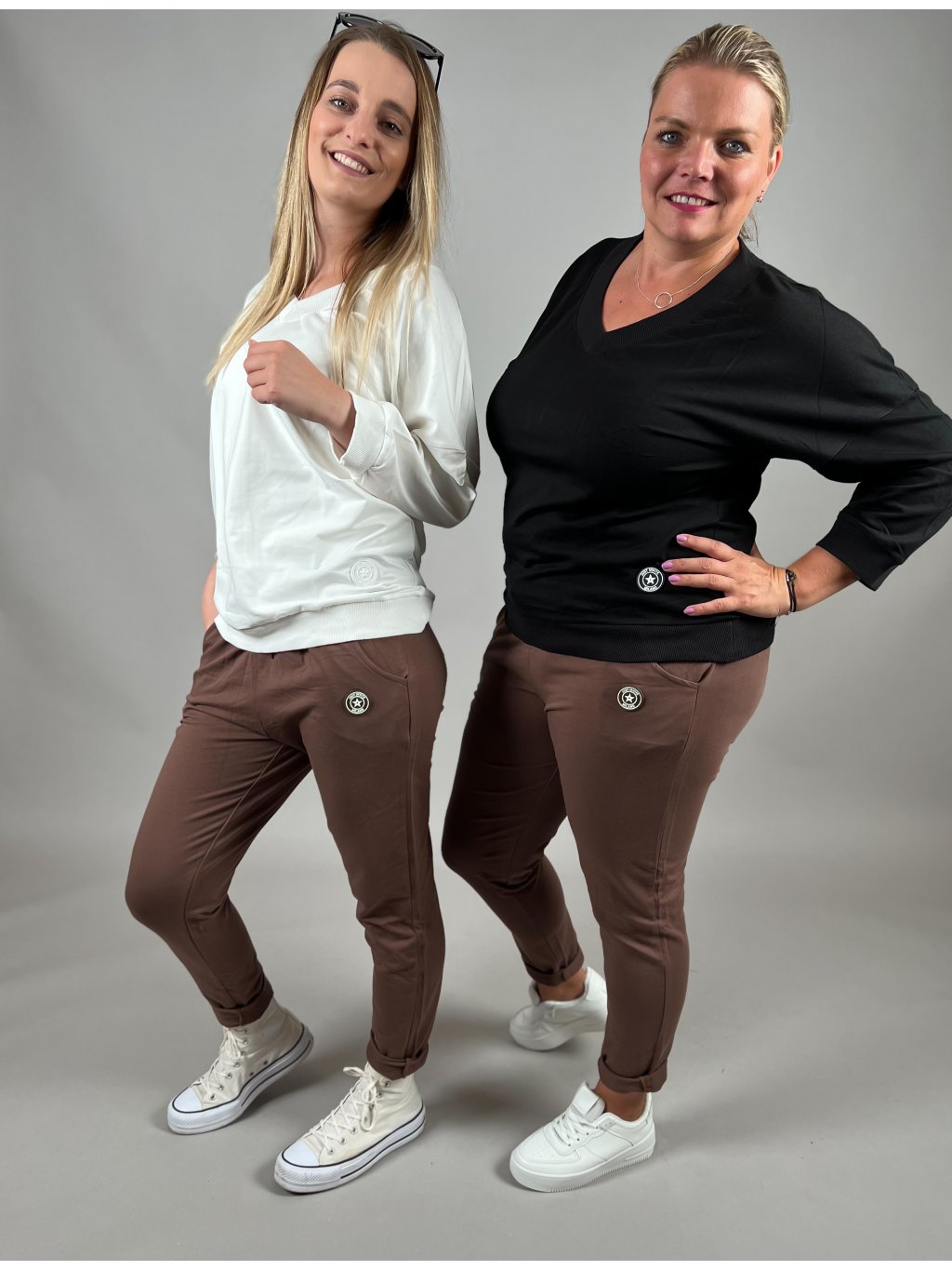 ONE SIZE strečové kalhoty v pase na gumu ozdobný štítek na kalhotech kalhoty s kapsami spodní část nohavic do gumy Rozměry: UNI-pas 66-90 boky 104 délka 97...