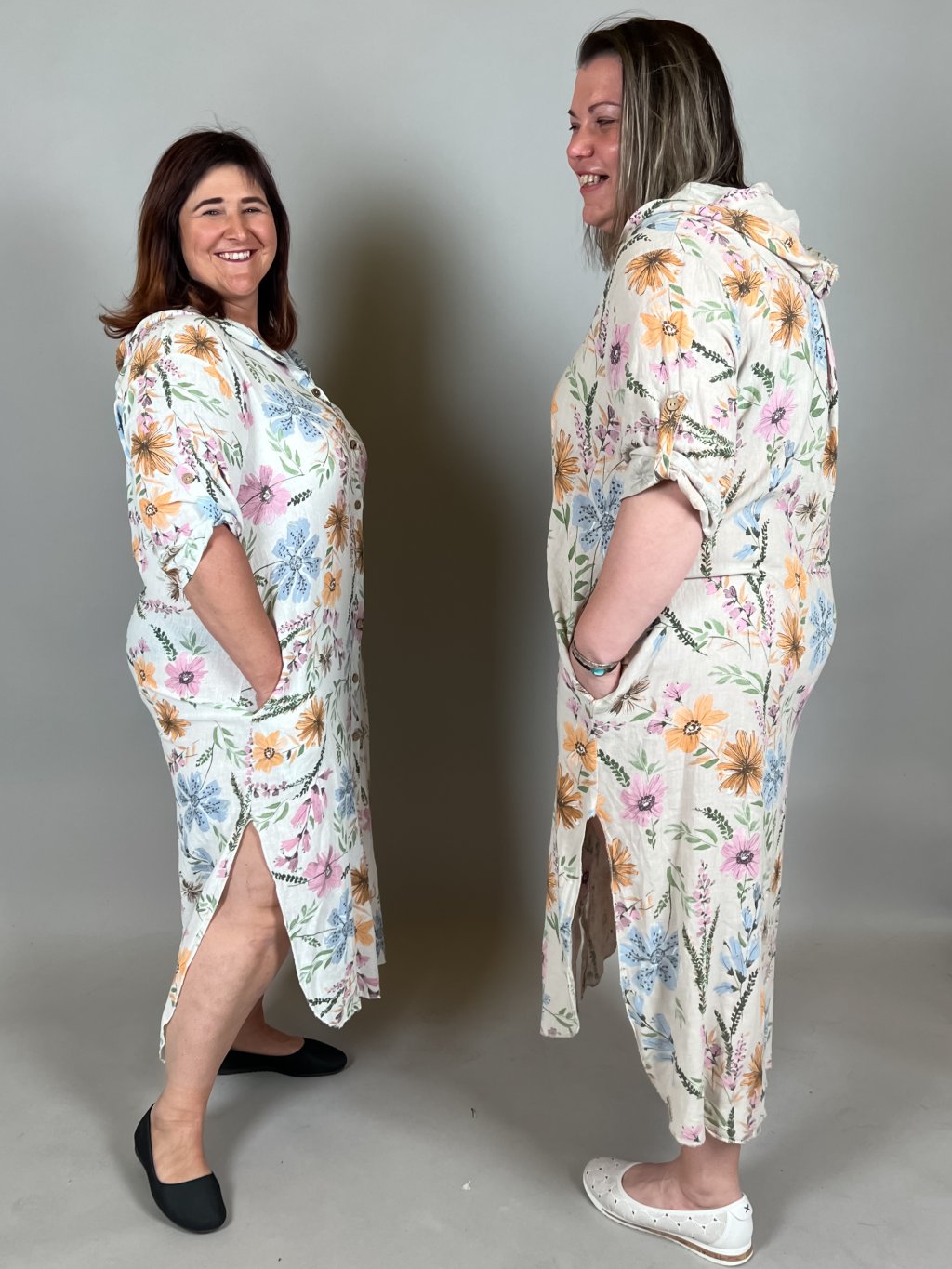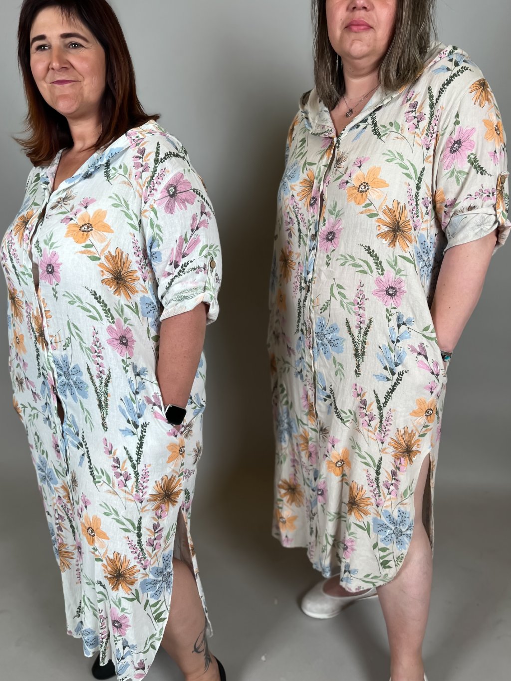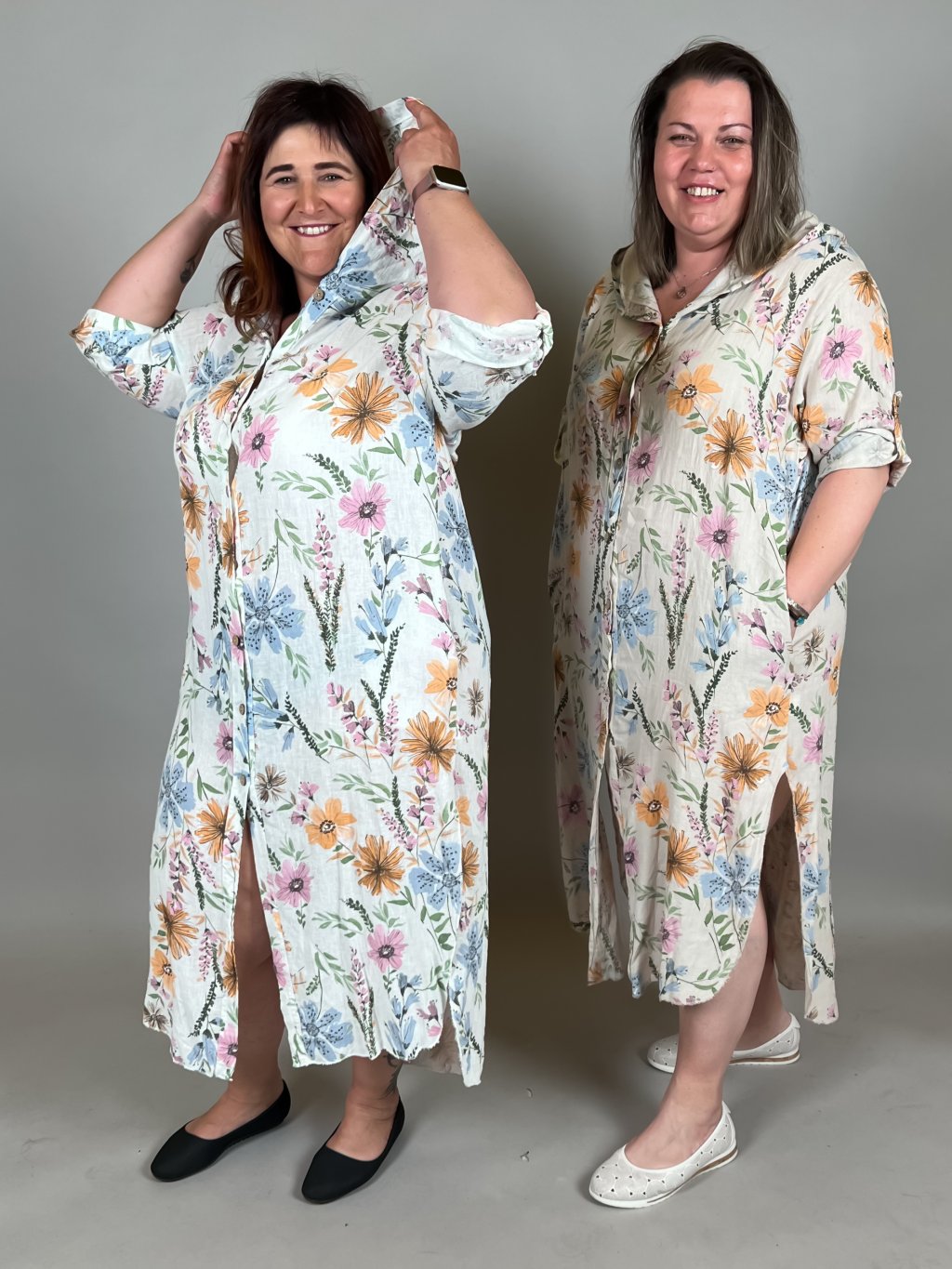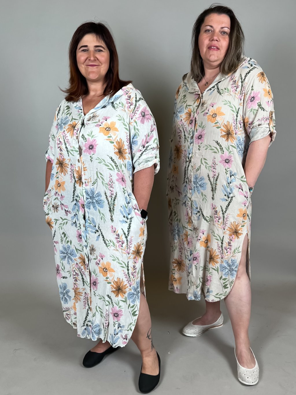 Krásné dlouhé lněné propínací šaty, které lze nosit i jako kabátek přes šaty. Hezký letní květinový potisk. K dispozici i ve větších velikostech. Uvedené míry odpovídají. Materiál příjemný. Doporučuji.
