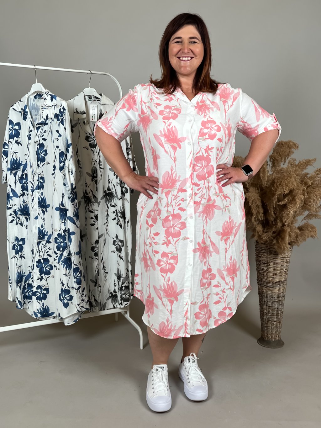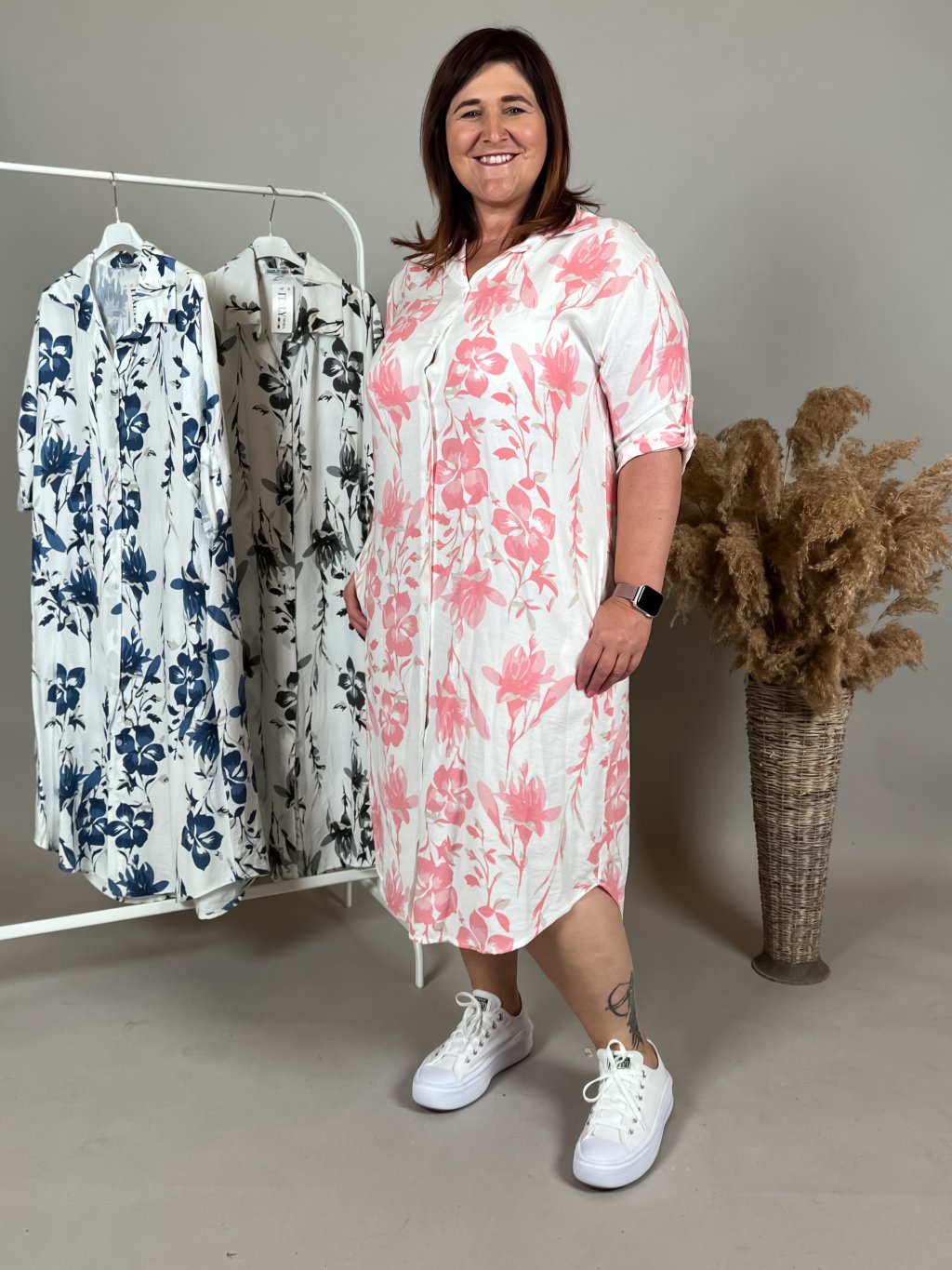 ONE SIZE propínací košilové šaty pásek na stažení pasu Rozměry: UNI-prsa 106 boky 102 délka 136 délka 130 rukáv 53 Složení: 100% viscosa Míry modelek jsou k dispozici...