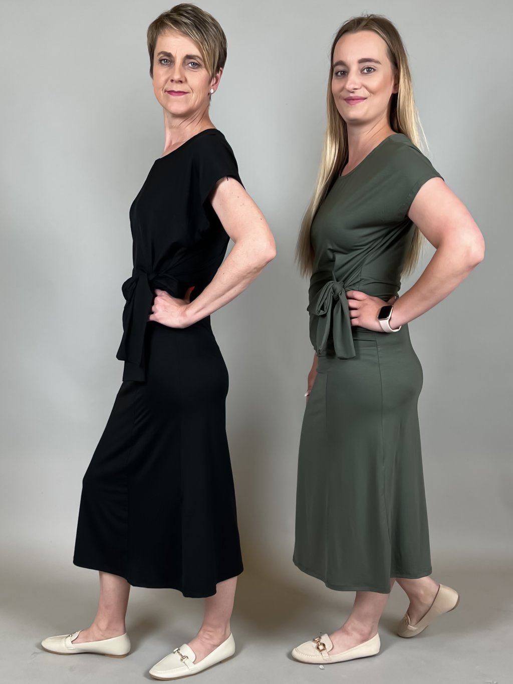 strečové šaty s kapsami pásek součástí límeček modelky fotí vel. 44 a 46 Rozměry: 44-prsa 112 boky 118 délka 99 rukáv 4446-prsa 116 boky 122 délka 100 rukáv 4548-prsa...