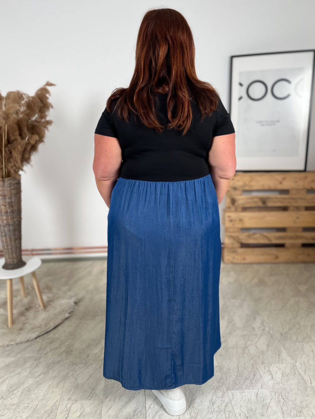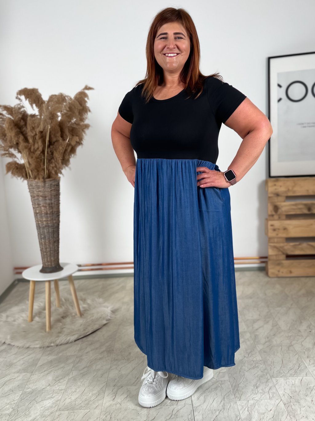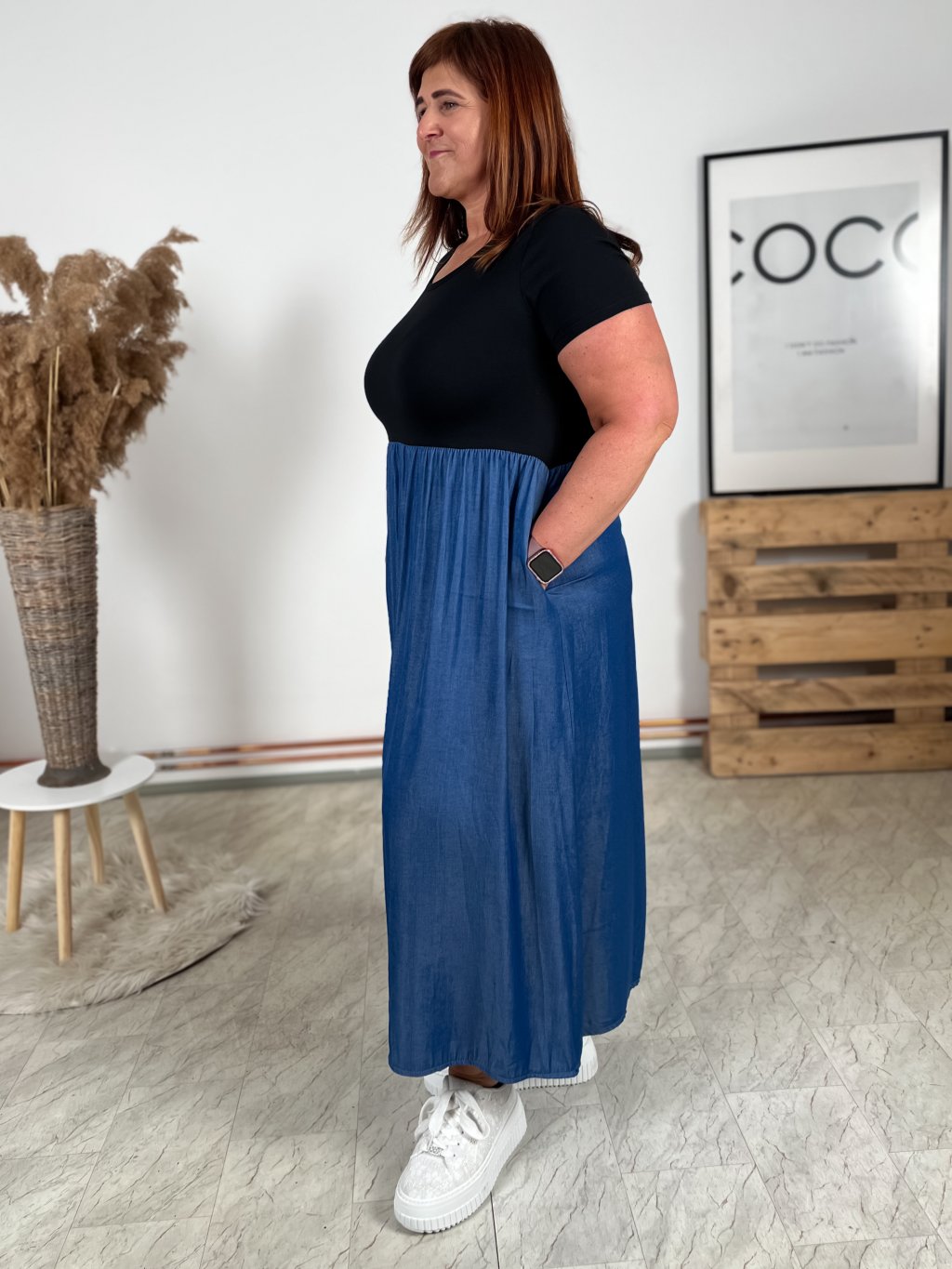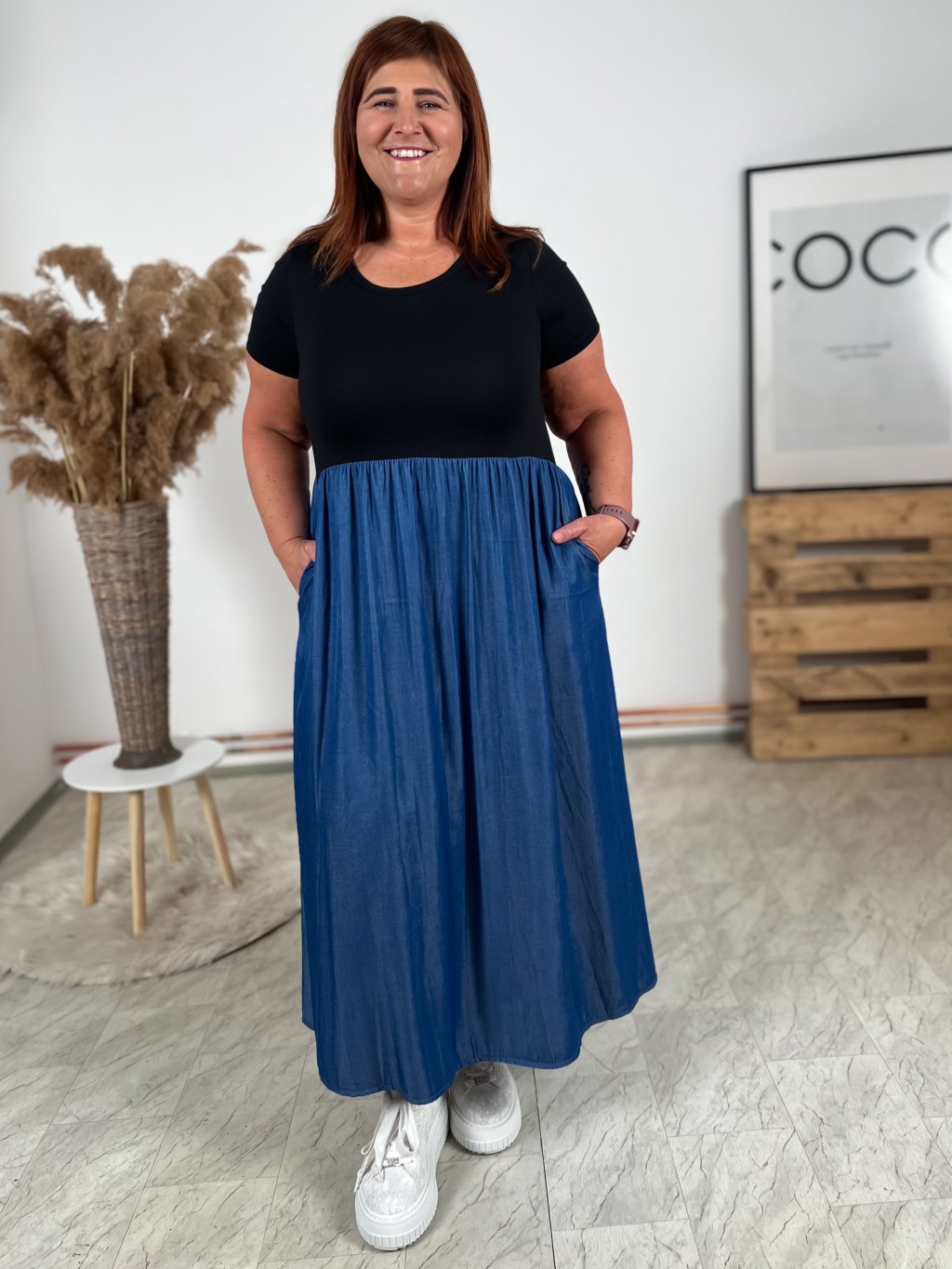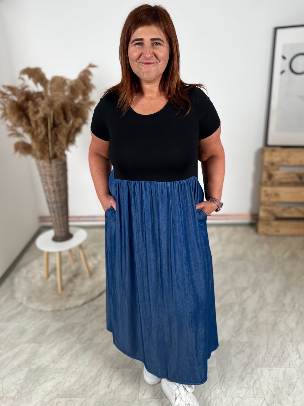 - strečový vrchní díl šatů, sukně pevnější s kapsami