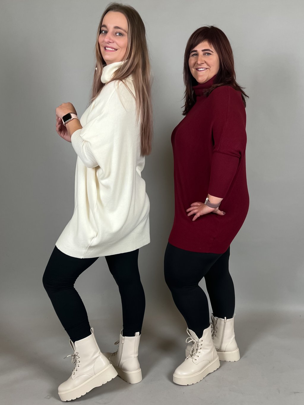 ONE SIZE příjemný strečový rolák tunikový rolák přední díl vykrojený Rozměry: UNI-prsa 134 boky 116 délka přední 68 zadní 81 rukáv 67 Míry modelek...