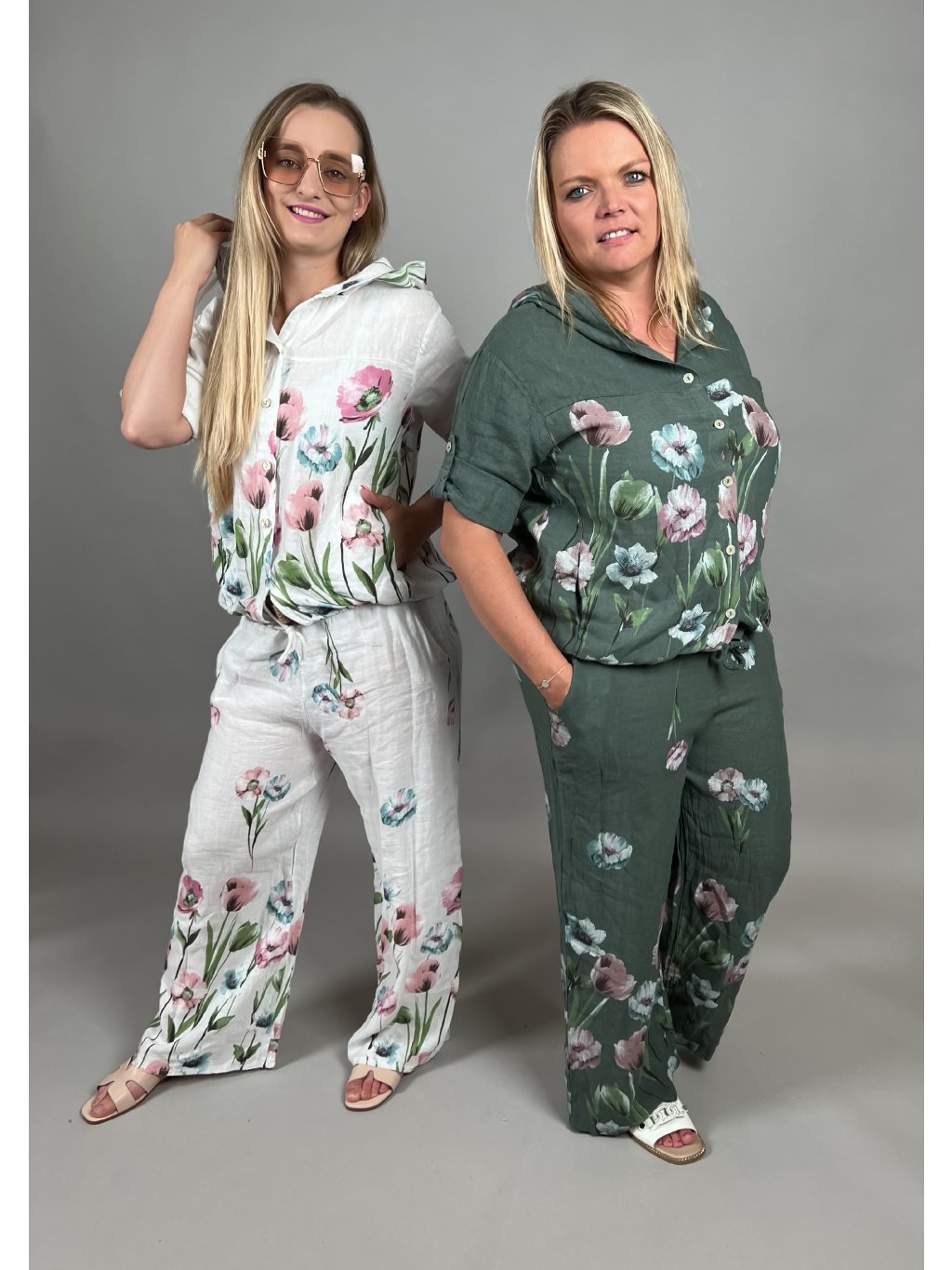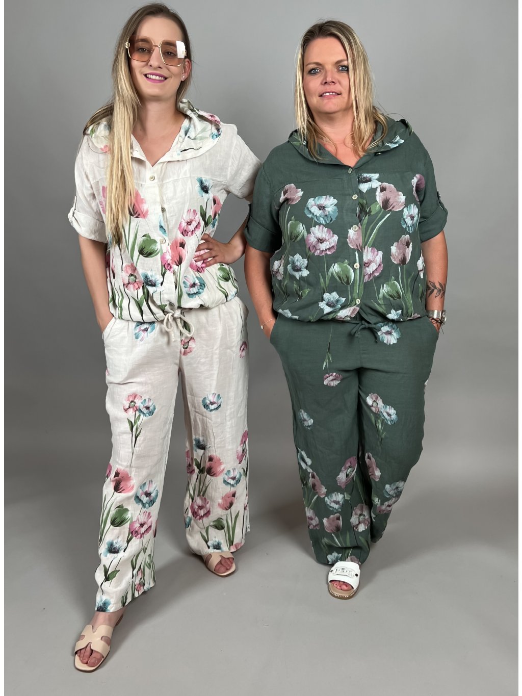 ONE SIZE lněné kalhoty v pase na gumu pásek u kalhoty kapsy Rozměry: UNI-pas 64-80 boky 118 délka 97 Složení: 55% len 45% bavlna Míry modelek...