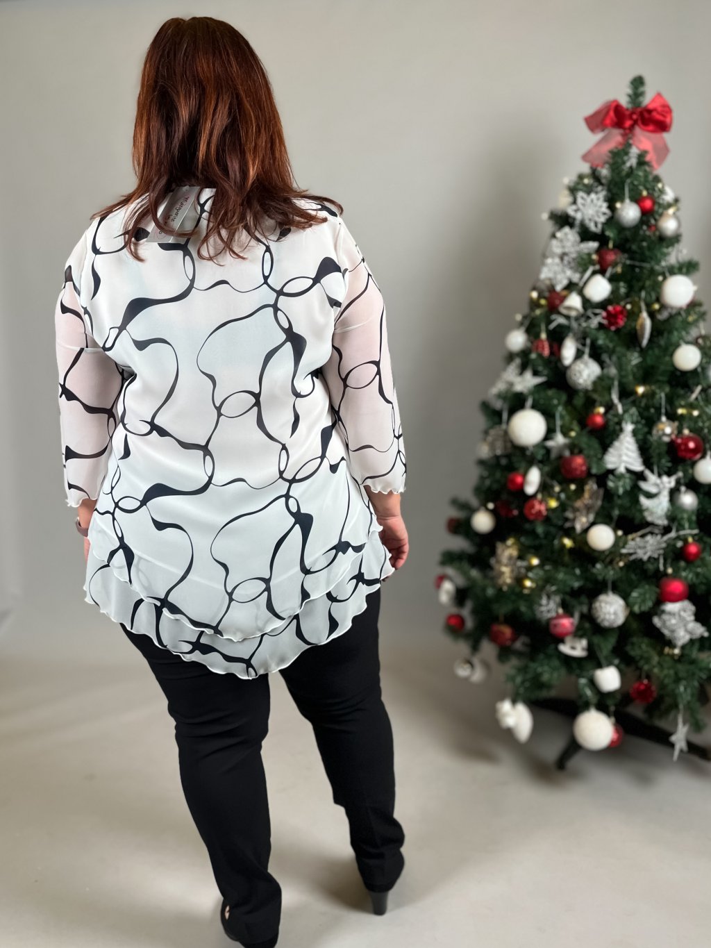 příjemná černo bílá košile ozdobné knoflíčky za zadní části košile modelky fotí velikost: Míša 40, Andrejka 46 3/4 rukáv Míry modelek jsou k dispozici...