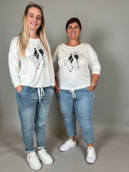 strečové tričko s tkaničkou na stažení modelky fotí velikost: Míša 44. Andrejka 46 příjemné tričko s 3/4 rukávem Míry modelek jsou k dispozici zde: Míry...