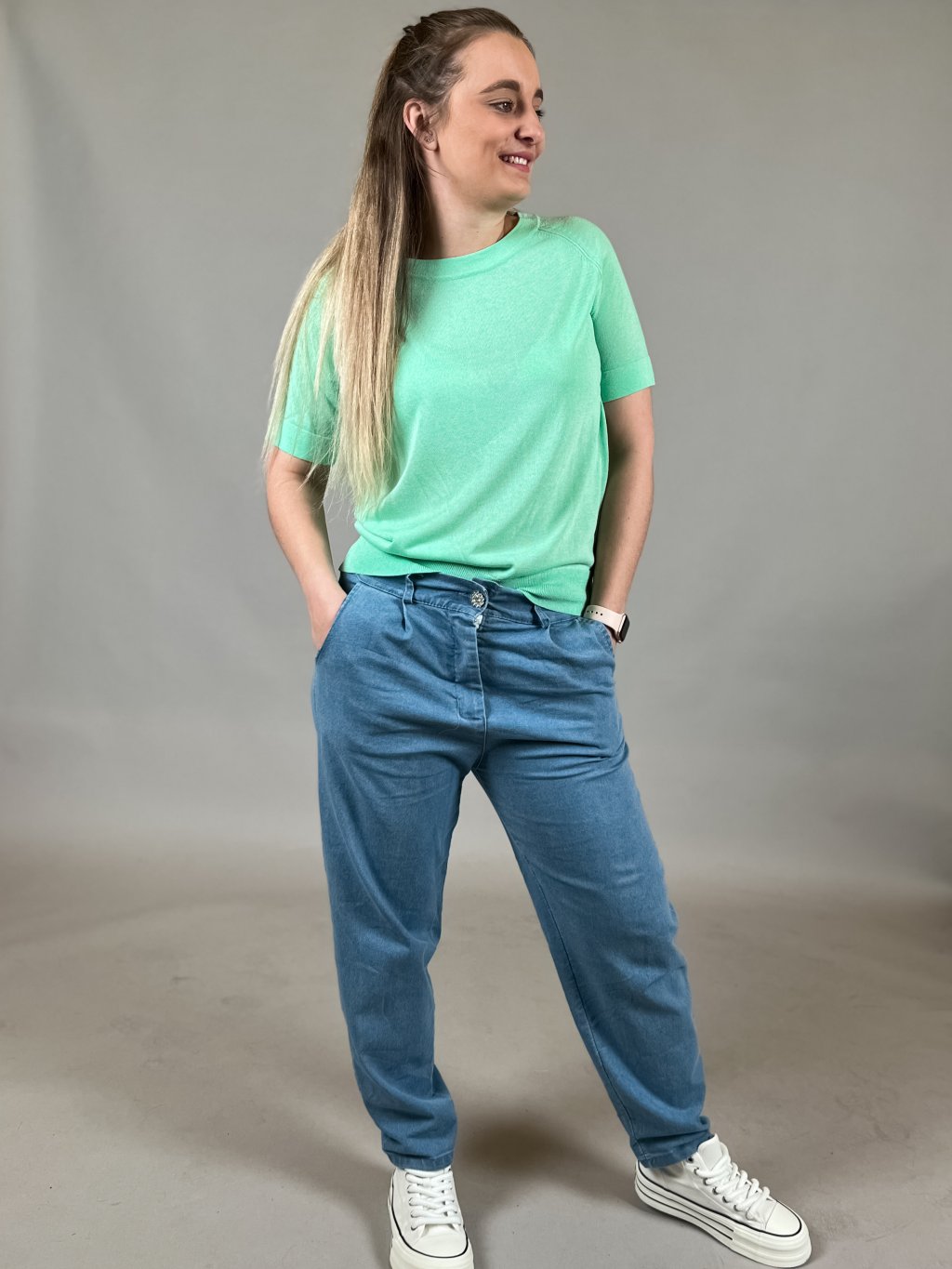 strečové tričko s tkaničkou na stažení modelky fotí velikost: Míša 44. Andrejka 46 příjemné tričko s 3/4 rukávem Míry modelek jsou k dispozici zde: Míry...