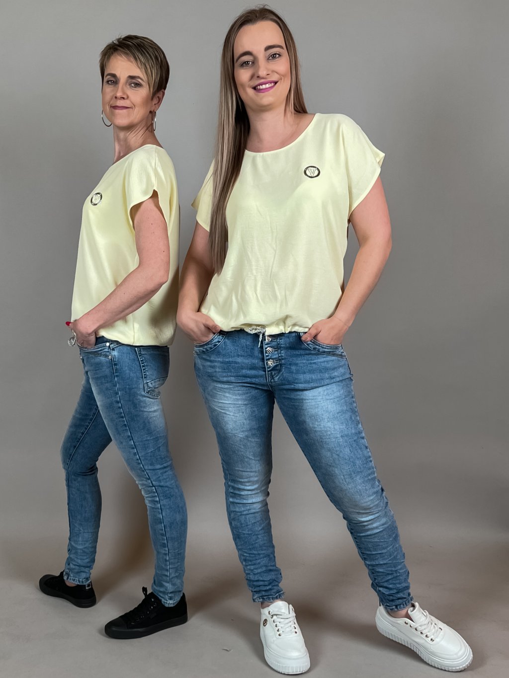 příjemné tričko s tkaničkou na spodní části ozdobný štítek na tričku modelky fotí velikost : Jarča 38 , Míša 38 Míry modelek jsou k dispozici zde: Míry...