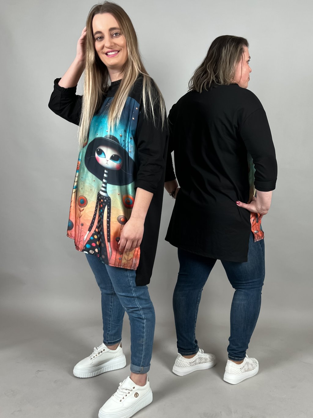 strečová bavlněná tunika tunika s nápisy a kapsou ozdobný zip u kapsy modelka fotí vel. XL tunika střihu A Rozměry: XL-prsa 114 boky 140 délka 88 rukáv...